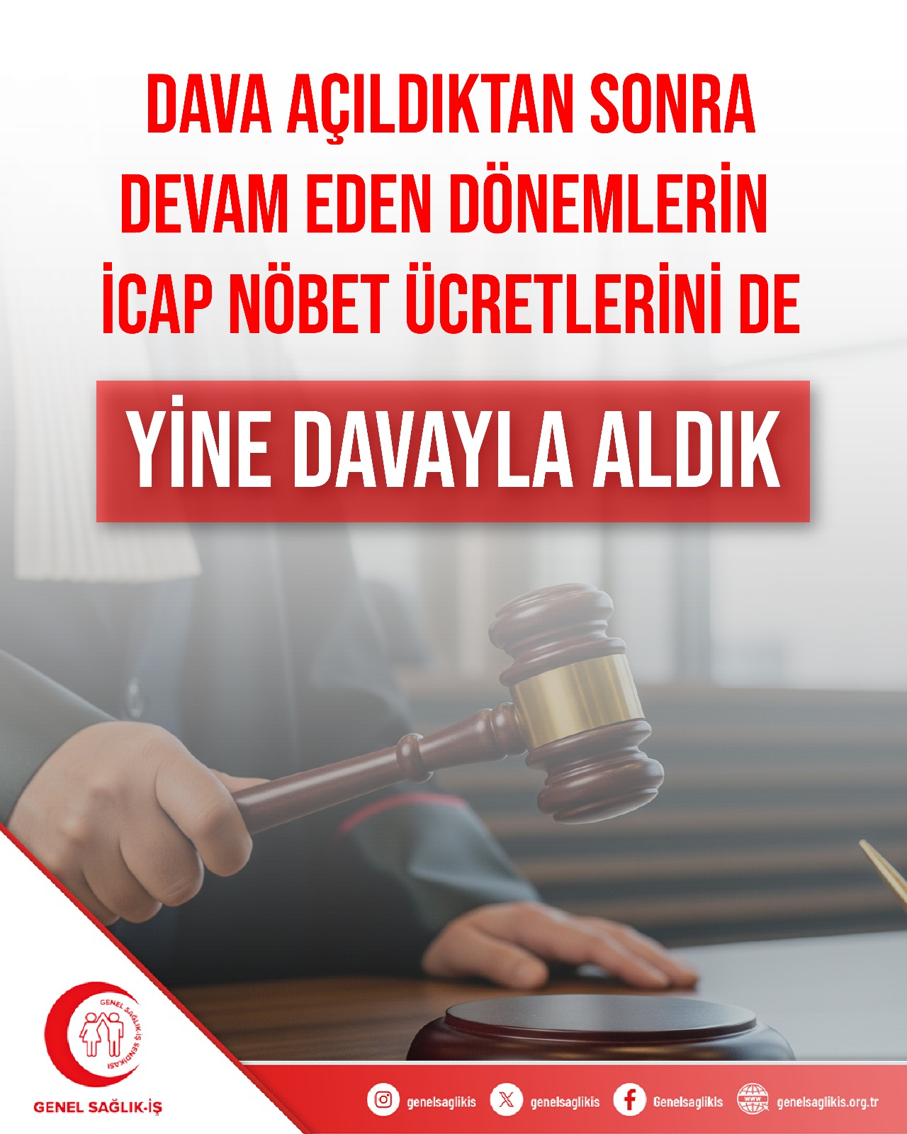 Genel Sağlık-İş olarak, hukuki zeminde “kendisine icap nöbeti verilen tüm sağlık çalışanlarının, icap nöbet ücretine kazanması gerektiğini savunmuştuk!” Vermiş olduğumuz hukuk mücadelesi neticesinde hem üyemizin hem de devam eden süreçte kendisine icap nöbeti verilen tüm sağlık çalışanlarının, icap nöbet ücretlerini alabilmesi için yine harika bir emsal karara imza atılarak, Genel Sağlık-İş farkı yine ortaya konulmuştur.