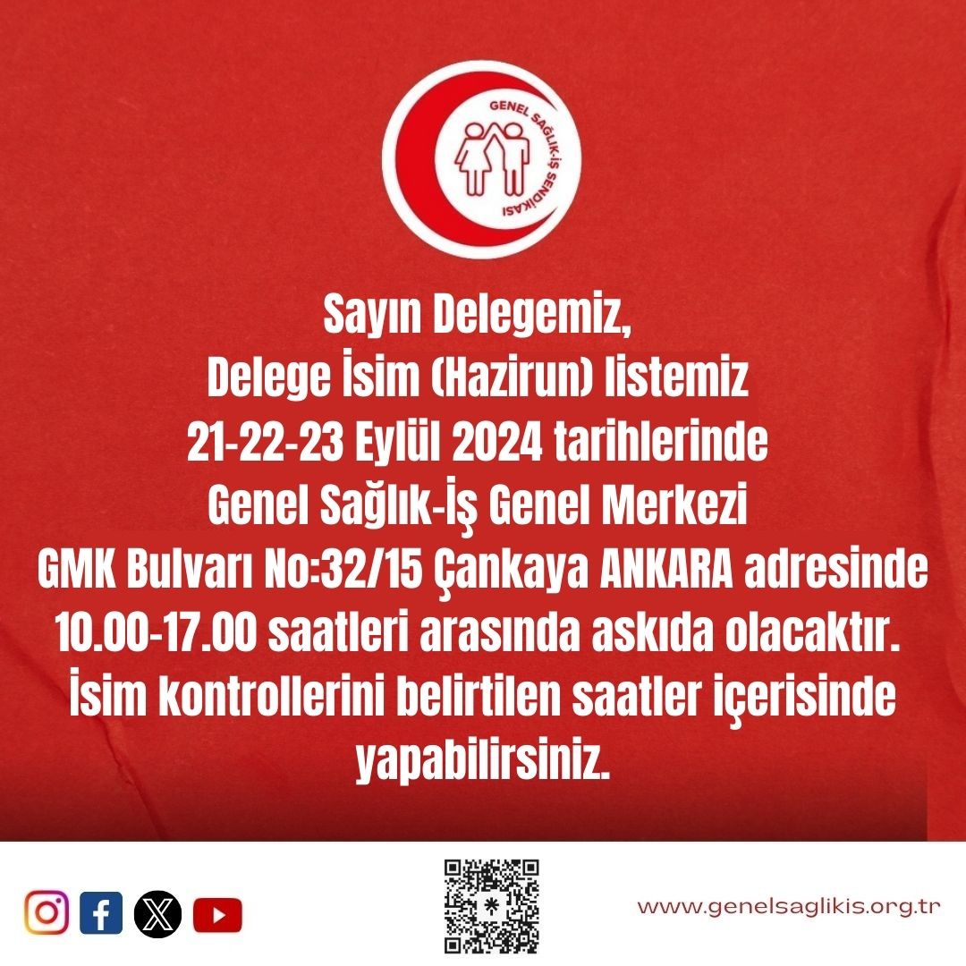 Sayın Delegemiz, Delege İsim (Hazirun) listemiz 21-22-23 Eylül 2024 tarihlerinde Genel Sağlık-İş Genel Merkezi GMK Bulvarı No:32/15 Çankaya ANKARA adresinde 10.00-17.00 saatleri arasında askıda olacaktır. İsim kontrollerini belirtilen saatler içerisinde yapabilirsiniz.