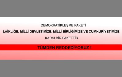 Başbakan Tayyip Erdoğan adına demokratikleşme paketi denilen gerici ve bölücü Cumhuriyet karşıtı paketi açıkladı. Paketin tamamı bir bütündür. Paket Mustafa Kemal Atatürk'ün önderliğinde kurulan Cumhuriyetimizi hedef almaktadır. Ortaçağ kurumlarına, tarikatlara, etnik kimliklere göre bölünmemize özgürlüktür. Milletimizin farklı etnik ve inançlara göre parçalanmasına özgürlüktür. Kadınlarımızın yeniden ikinci sınıf olmasına, giderek üretimden kopması ve eve hapsolmasına özgürlüktür. Köylümüzün ağalığa, şeyhliğe, kan davasına, kumalık kurumuna, marabalığa mahkum edilmesidir. Kutuplaşma ve iç savaşa özgürlüktür. Birliğimiz hedeftedir. Bütünlüğümüz hedeftedir. Bizi bir arada tutan laikliğimiz hedeftedir.