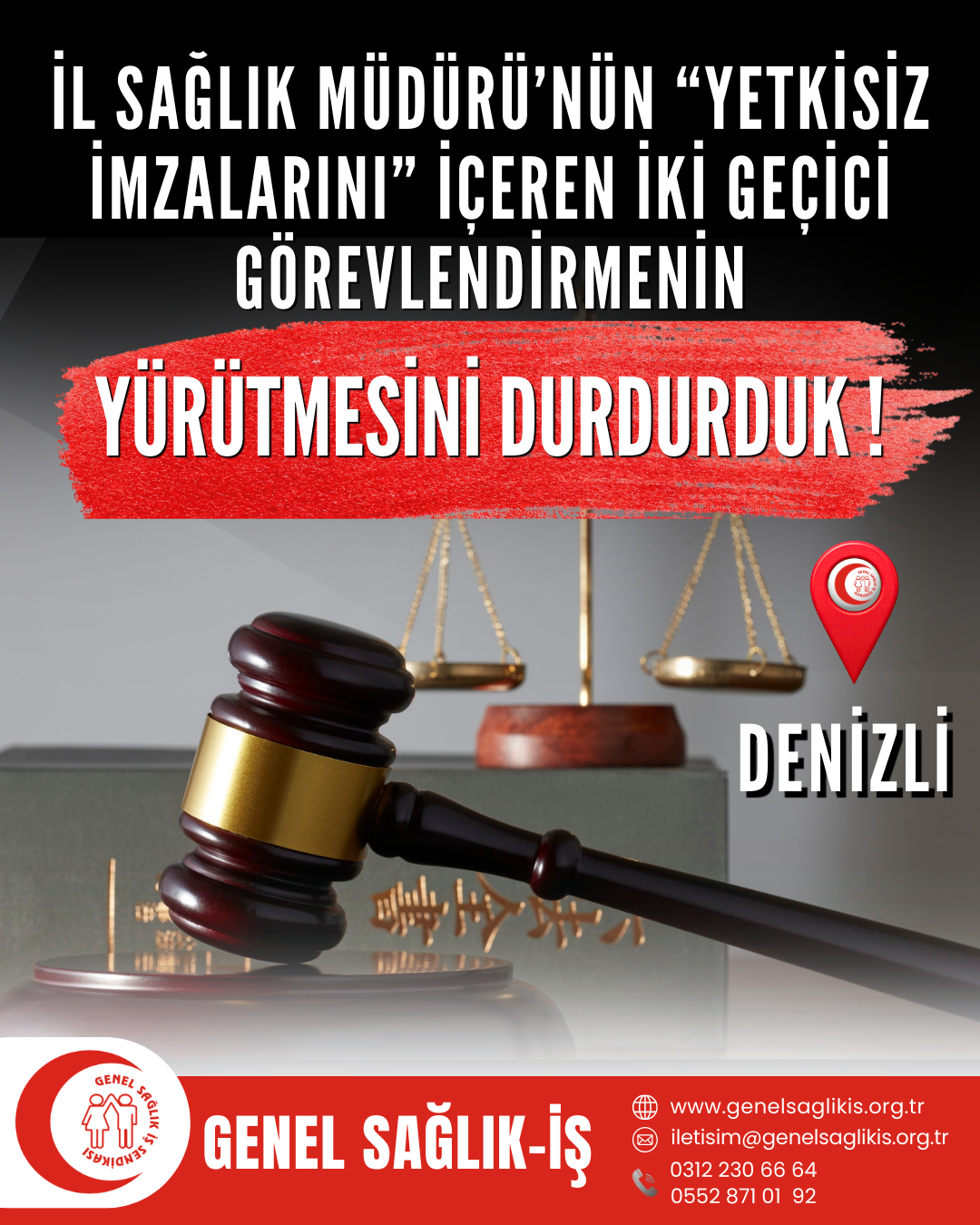 Genel-Sağlık-İş, bu kararla birlikte Denizli’de de “YETKİSİ BULUNMAMASINA RAĞMEN İDARİ İŞLEME İMZA ATAN BİR İL SAĞLIK MÜDÜRÜNE UNUTAMAYACAĞI BİR DERS VERMİŞTİR.”
