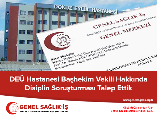Yükseköğretim Kurulu’na gönderilen yazıda, DEÜ Hastanesi Başhekim Vekili Prof. Dr. Semih Küçükgüçlü hakkında disiplin soruşturmasının yapılarak gerekli yaptırımların uygulanması ve sonuçtan Genel Sağlık-İş’e de bilgi verilmesi talep edildi.