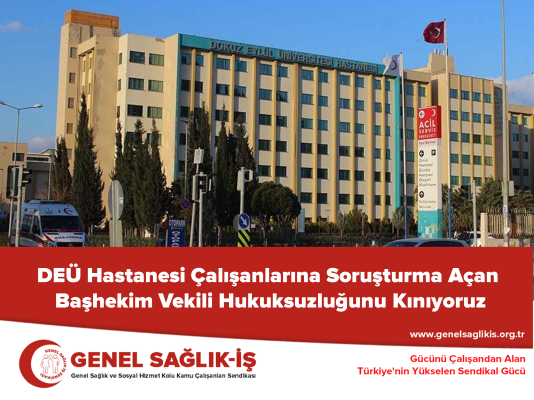 Döner sermaye ödemelerindeki düşüşün nedenlerini öğrenmek isteyen sendika temsilcileri ile görüşmeyi reddeden Dokuz Eylül Üniversitesi Hastanesi Başhekim Vekilini; eylem yapan sağlık çalışanlarına soruşturma açarak sağlık emekçisi meslektaşlarını tehdit etmek yerine, onların haklı taleplerine cevap vermeye çağırıyor ve kendisine uluslararası sözleşmeleri okumasını tavsiye ediyoruz.