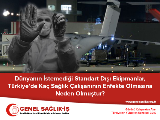 Türkiye'de sağlık kurum ve kuruluşlarında kullanılan kişisel koruyucu ekipmanların standartlara uygun olmadığını Genel Sağlık-İş olarak pek çok kez ifade etmiştik. Ancak tüm çağrılarımıza kulak tıkayan yandaş basın ve siyasi iktidar bu konuda da gereğini yapmamıştır. Sağlık Bakanı Fahrettin Koca’ya soruyoruz; enfekte olan sağlık personelinden kaçı standartlara uygun olmayan kişisel koruyucu ekipman kullandığı için enfekte olmuştur?