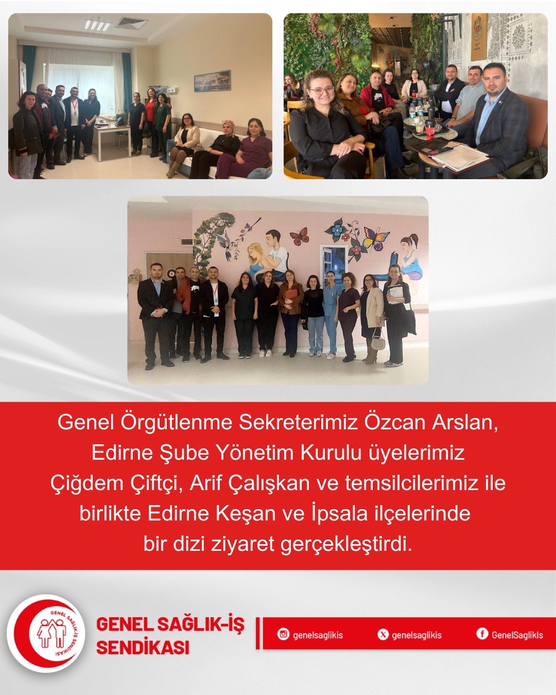 Genel Örgütlenme Sekreterimiz Özcan Arslan, Edirne Şube Yönetim Kurulu üyelerimiz Çiğdem Çiftçi, Arif Çalışkan ve temsilcilerimiz ile birlikte Edirne Keşan ve İpsala ilçelerinde bir dizi ziyaret gerçekleştirdi.