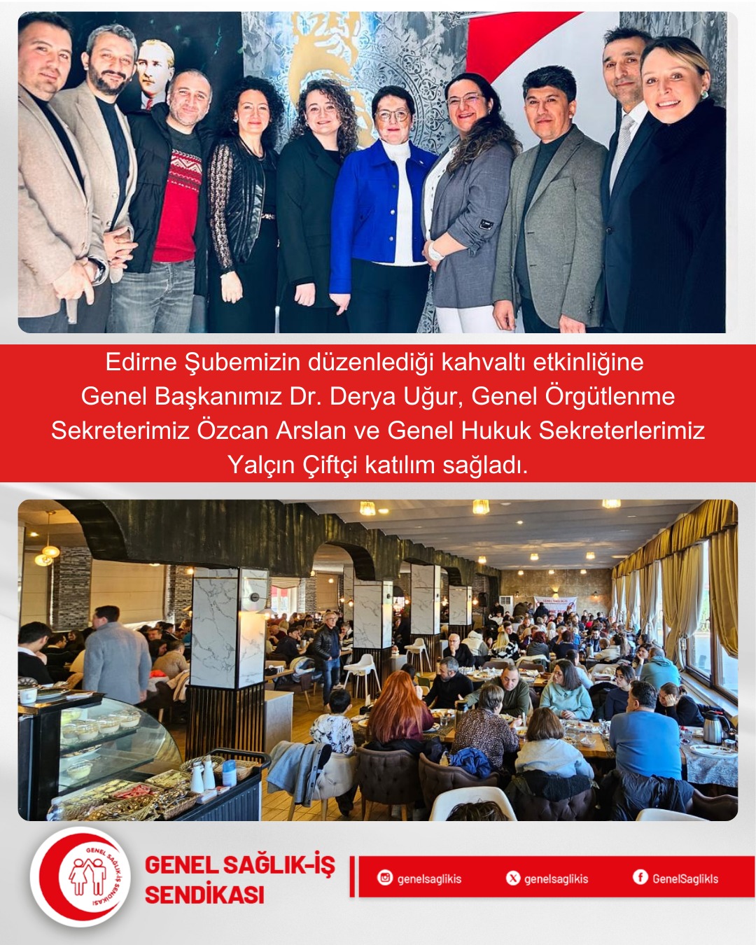 Edirne Şubemizin düzenlediği kahvaltı etkinliğine Genel Başkanımız Dr. Derya Uğur, Genel Örgütlenme Sekreterimiz Özcan Arslan ve Genel Hukuk Sekreterlerimiz Yalçın Çiftçi katılım sağladı.