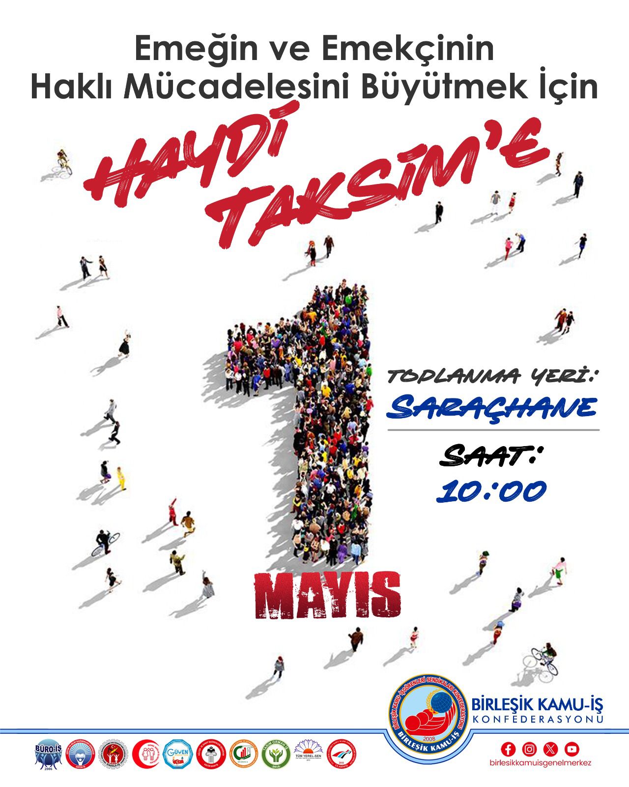 1 Mayıs’ta Ekmeğimizi büyütmek için, İnsanca yaşamak için, 1 Mayıs’ta tüm emekçileri, Taksim’e yürümek üzere Saraçhane’de buluşmaya çağırıyoruz. Taksim’de buluşmaya davet ediyoruz.