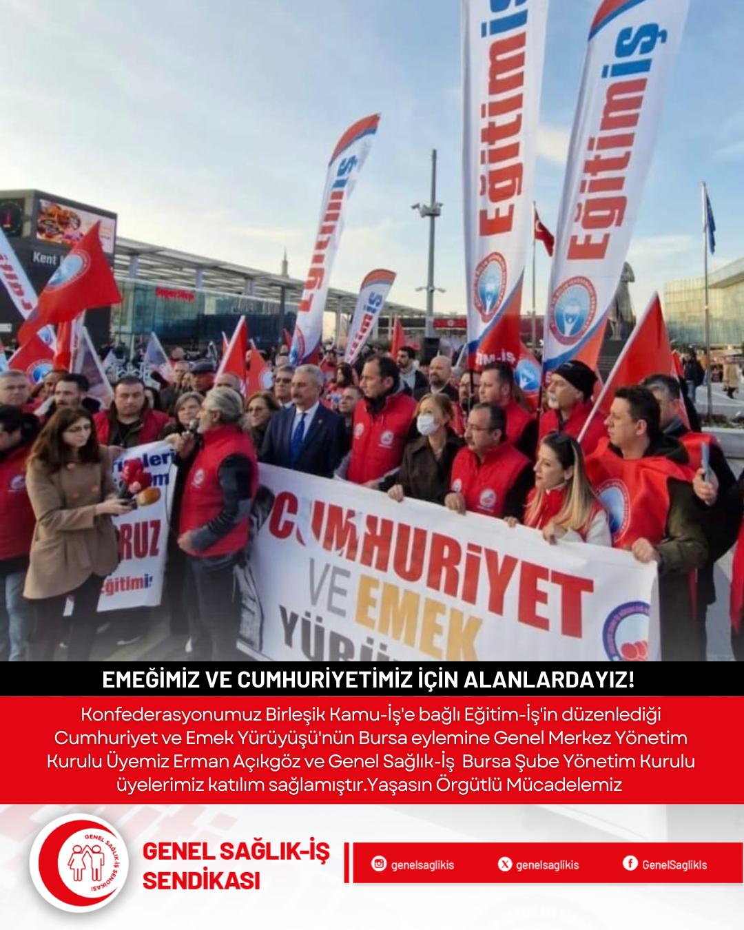 Konfederasyonumuz Birleşik Kamu-İş'e bağlı Eğitim İş'in düzenlediği Cumhuriyet ve Emek Yürüyüşü'nün Bursa eylemine Genel Merkez Yönetim Kurulu Üyemiz Erman Açıkgöz ve Genel Sağlık-İş Bursa Şube Yönetim Kurulu üyelerimiz katılım sağlamıştır. Yaşasın Örgütlü Mücadelemiz