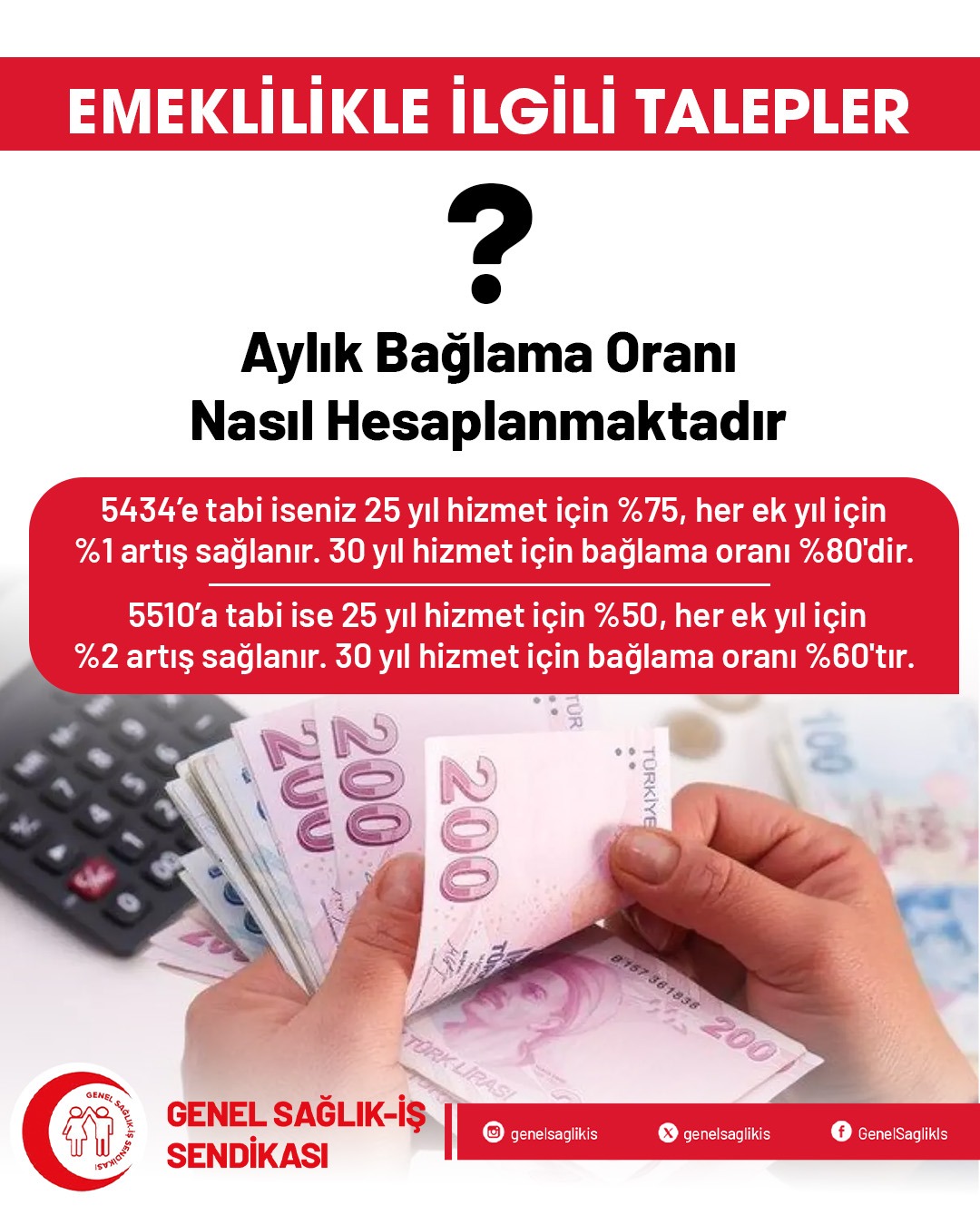 5434'e tabi iseniz 25 yıl hizmet için %75, her ek yıl için %1 artış sağlanır. 30 yıl hizmet için bağlama oranı %80'dir.