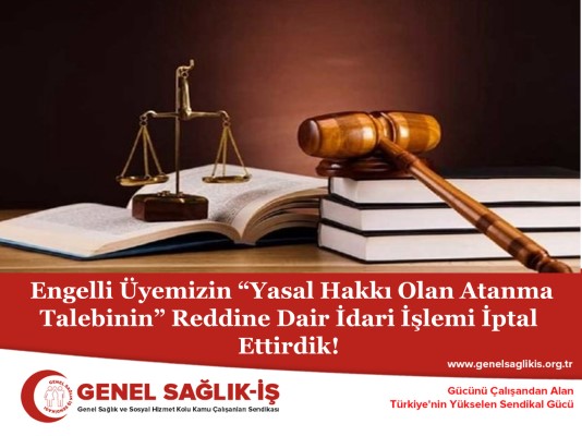 Bursa’da bir devlet hastanesinde görev yapmakta olan Genel Sağlık-İş üyesinin, sağlık sorunları ve % 92 engellilik durumu nedeniyle, mevcut görevinin sürdüğü devlet hastanesine ulaşımı gün geçtikçe zorlaşmaya başlamıştır. Bu nedenle üyemiz, ikamet adresine yakın olan İlçe Sağlık Müdürlüğü veya başka bir devlet hastanesine atamasının yapılması için idareye başvurmuştur. İdare, “üyemizin engellilik durumunu, sağlık sorunlarını ve mevcut görevinin devam ettiği hastaneye ulaşımının gün geçtikçe zor hale geldiği hususlarını” dikkate almaksızın, üyemizin, “ikamet adresine en yakın 2 sağlık kurumundan birisine atanması” yönündeki talebinin reddine karar vermiştir.