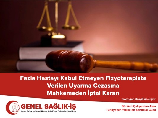 “Bakılan uyuşmazlıkta, soruşturma dosyasının içeriği, soruşturma raporu ve eklerinin birlikte değerlendirilmesinden; Aydın Devlet Hastanesi Fizik Tedavi Ünitesinde fizyoterapist olarak görev yapan davacının olay günü tıbben kabul gören günlük alması gereken hasta sayısı olan 16 hasta sayısına ulaşmış olduğu, 17. hastayı alamayacağını bildirmesi üzerine başka bir fizyoterapiste yönlendirildiği, yukarıdaki bilgiler doğrultusunda davacının yapmış olduğu işin süre gerektiren ve 15 ila 30 seans arasında değişen bir tedavi süreci olduğu, tedavi gören hastaların tedavilerinin aksamaması için süreye ve planlamaya son derece dikkat edilmesi gerektiği, yeni alınacak bir hastanın tüm tedavi programını olumsuz etkileyebileceği, davacının olay günü 14 hastasının gelmiş olmasının ertesi gün de kayıtlı hastaların gelmeyeceği anlamını taşımadığı ve hastaların yeterli ve doğru tedavi görebilmesi için planlamanın çok önemli olduğu açık iken, önceden yapılan planlamaya uyması sebebi ile davacı hakkında tesis edilen uyarma cezasına yapılan itirazın reddi yönündeki dava konusu işlemde hukuka uyarlık bulunmadığı kanaatine varılmıştır.” gerekçesiyle üyemize verilen uyarma cezasının iptaline karar vermiştir.