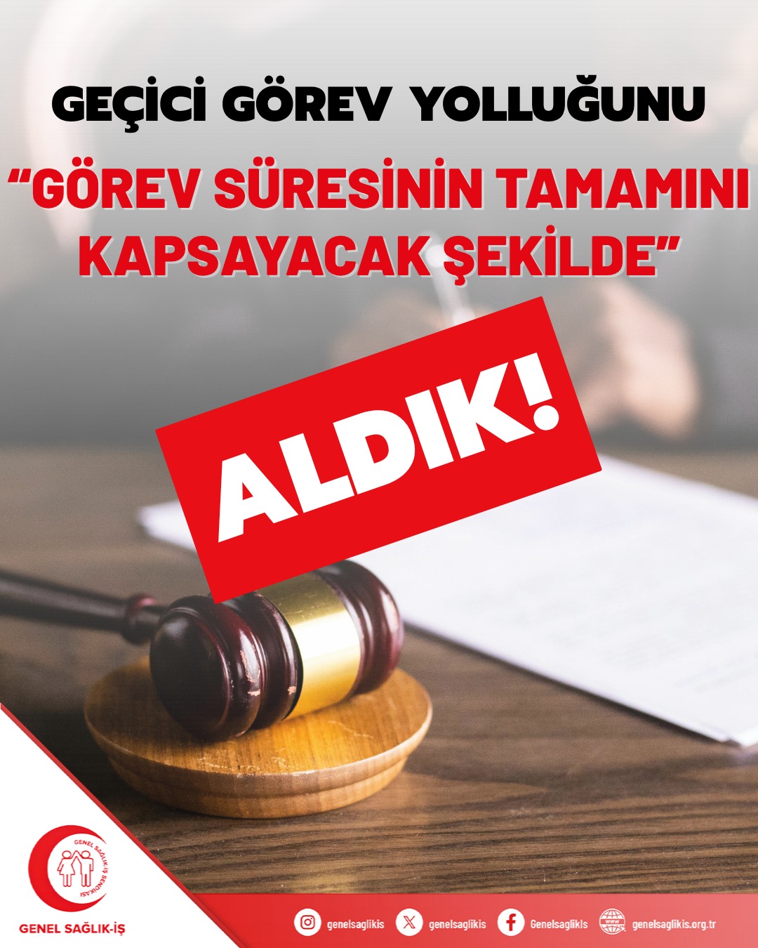Manisa Salihli’de bir Acil Sağlık Hizmetleri İstasyonu'nda (ASHİ) görev yapmakta olan üyemiz, Alaşehir’de bir ASHİ’na re'sen geçici görevlendirilmiştir. Üyemizin "Yurtiçi Geçici Görev Yolluğu Bildirimi" idare tarafından "…Acil Sağlık Hizmetleri personelleri yirmi dört (24) saat nöbet usulüne göre çalıştığı için ilgili personelin adına tahakkuk edecek geçici görev yolluğunun tuttukları nöbet gün sayısına göre hesaplanarak…" denilerek, kabul edilmemiş, hak edişleri ödenmemiştir. Bunun üzerine Sendikamız Genel Sağlık-İş tarafından Manisa 2. İdare Mahkemesi’nde açılan davanın kararında, “geçici olarak görevlendirilmeye ilişkin işleme bakıldığında hangi tarihlerde görevli olduğu belirtilerek adına tahakkuk edilecek yolluk ve yevmiye giderlerinin 6245 sayılı Harcırah Kanununa göre karşılanmasının da açıkça belirtildiği, nöbet hususuna ilişkin durumun davacının görev yaptığı birimin çalışma düzeninden (12 ve 24 saat nöbet esasına göre çalışmasından) kaynaklandığı, çalışma düzeninden kaynaklanan bu durumun ise davacının aleyhine yorumlanamayacağı, dolayısıyla davacı hakkında yapılan geçici görevlendirmede belirtilen zaman zarfında görevini ifa ettiği…” denilerek, haklı davamızda, geçici görev yolluğu ile ilgili olarak üyemizin hak edişlerinin, yasal faiziyle birlikte kendisine ÖDENMESİNE karar verilmiştir.