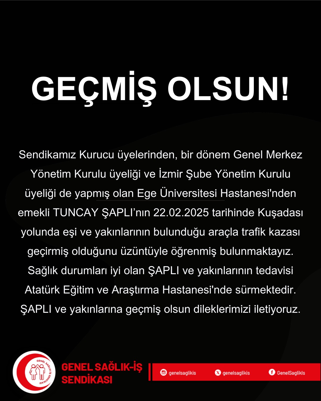 Sendikamız Kurucu üyelerinden, bir dönem Genel Merkez Yönetim Kurulu üyeliği de yapmış olan Ege Üniversitesi Hastanesi'nden emekli Tuncay Şaplı'nın 22.02.2025 tarihinde Kuşadası yolunda eşi ve yakınlarının bulunduğu araçla trafik kazası geçirmiş olduğunu üzüntüyle öğrenmiş bulunmaktayız. Sağlık durumları iyi olan Şaplı ve yakınlarının tedavisi Atatürk Eğitim ve Araştırma Hastanesi’nde sürmektedir. Şaplı ve yakınlarına geçmiş olsun dileklerimizi iletiyoruz.