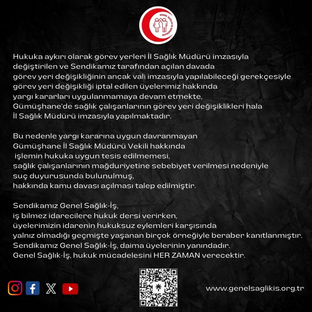 Hukuka aykırı olarak görev yerleri İl Sağlık Müdürü imzasıyla değiştirilen ve Sendikamız tarafından açılan davada görev yeri değişikliğinin ancak vali imzasıyla yapılabileceği gerekçesiyle görev yeri değişikliği iptal edilen üyelerimiz hakkında yargı kararları uygulanmamaya devam etmekte, Gümüşhane’de sağlık çalışanlarının görev yeri değişiklikleri hala İl Sağlık Müdürü imzasıyla yapılmaktadır. Bu nedenle yargı kararına uygun davranmayan Gümüşhane İl Sağlık Müdürü Vekili hakkında işlemin hukuka uygun tesis edilmemesi, sağlık çalışanlarının mağduriyetine sebebiyet verilmesi nedeniyle suç duyurusunda bulunulmuş, hakkında kamu davası açılması talep edilmiştir. Sendikamız Genel Sağlık-İş, iş bilmez idarecilere hukuk dersi verirken, üyelerimizin idarenin hukuksuz eylemleri karşısında yalnız olmadığı geçmişte yaşanan birçok örneğiyle beraber kanıtlanmıştır. Sendikamız Genel Sağlık-İş, daima üyelerinin yanındadır. Genel Sağlık-İş, hukuk mücadelesini HER ZAMAN verecektir.