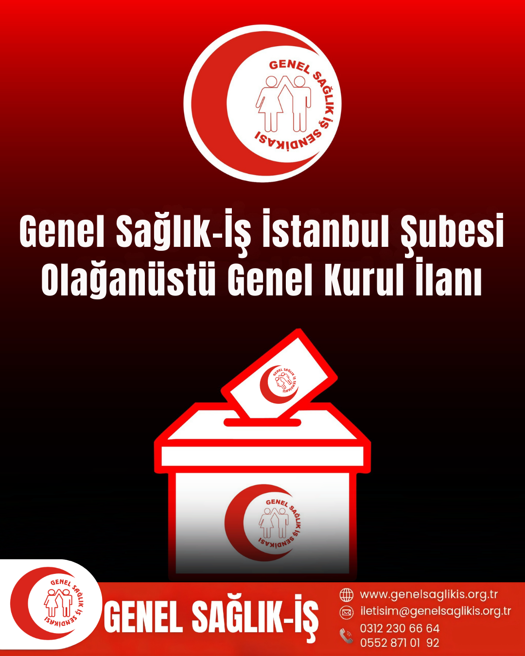 Sendikamız İstanbul Şubesi’nin 1. Olağan Genel Kurulu, organ seçimi için kayıtlı üyeler ile 7 Mart 2026 tarihinde Gayrettepe Barbaros Bulvarı No:159 Beşiktaş/İstanbul adresinde saat 12.00 ile 17.00 arasında çoğunluklu olarak yapılacaktır. Bu tarihte yeterli çoğunluk sağlanamadığı takdirde ikinci toplantısı 8 Mart 2026 tarihinde Gayrettepe Barbaros Bulvarı No:159 Beşiktaş/İstanbul adresinde saat 12.00 ile 17.00 arasında aşağıdaki gündemlerle yapılacaktır.