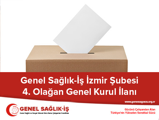 Genel Sağlık-İş sendikamızın İzmir Şubesi 4.Olağan Genel Kurul toplantısı, sendika organlarının ve genel merkez delege seçiminin çoğunluklu olarak 03.10. 2020 tarihinde 10.00-18.00 saatleri arasında Genel Sağlık-İş İzmir Şubesi (Konak Mahallesi Emek 896 sokak Emek İşhanı No: 2 D:2 Konak/ İzmir) adresinde yapılmasına, çoğunluk sağlanamadığı takdirde; çoğunluksuz olarak ikinci toplantının, sendika organlarının ve genel merkez delegelerinin seçiminin 10.10.2020 tarihinde Konak Belediyesi Selahattin Akçiçek Kültür Merkezi Avni Anıl Sahnesi (İnönü Caddesi, No:2/1, Bayramyeri- Konak/İzmir) adresinde 10.00-18.00 saatleri arasında yapılacaktır. İzmir Şubemiz üyelerine duyurulur.