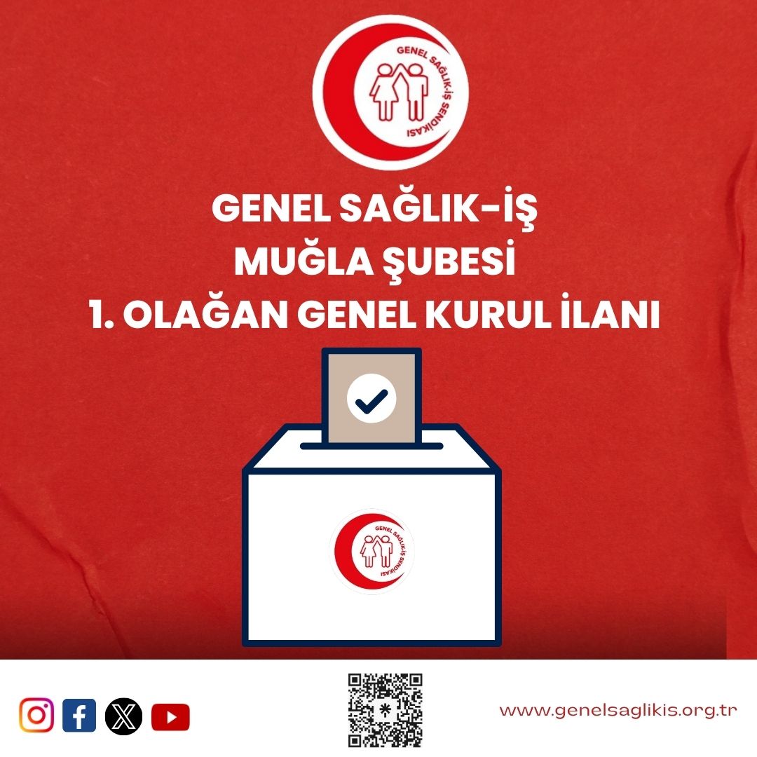 Genel Sağlık-İş Muğla Şube Yönetim Kurulu’nun 14.05.2024 tarih ve 11 sayılı 1. Olağan Genel Kurul kararı gereği, Sendikamız 1.Olağan Genel Kurulu 23 Temmuz 2024 tarihinde Saat: 14.00-17.30 arası Müştakbey Mah. Orgeneral Mustafa Muğlalı Cd. Konakaltı İskender Alper Kültür Merkezi No:51 Menteşe/MUĞLA adresinde Ekte belirlenen gündeme uygun olarak Şube Yönetim Kurulu ve Hazirun listesindeki üyeleri ile yapılacaktır.