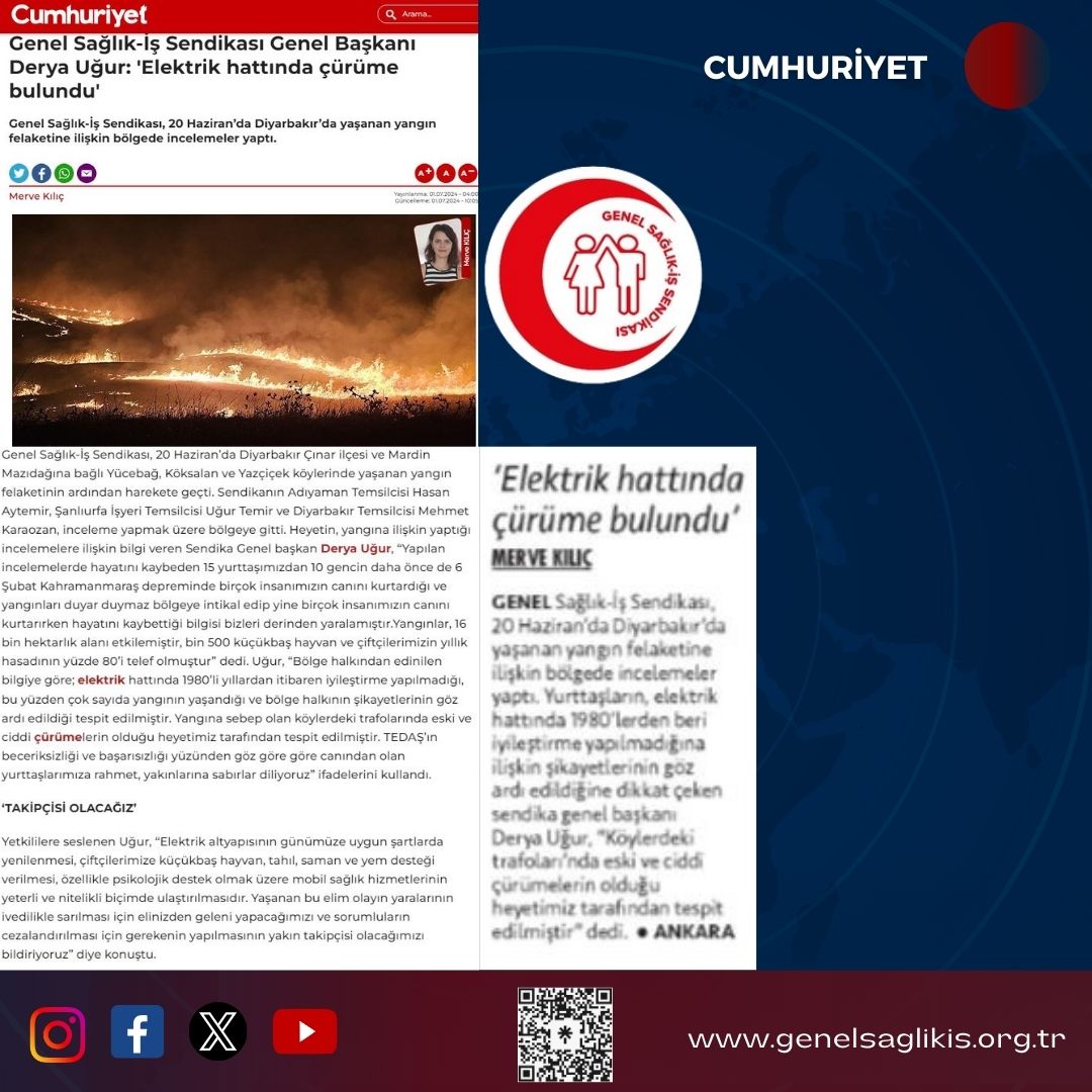 Genel Sağlık-İş Sendikası, 20 Haziran’da Diyarbakır’da yaşanan yangın felaketine ilişkin bölgede incelemeler yaptı.Genel Sağlık-İş Sendikası, 20 Haziran’da Diyarbakır Çınar ilçesi ve Mardin Mazıdağına bağlı Yücebağ, Köksalan ve Yazçiçek köylerinde yaşanan yangın felaketinin ardından harekete geçti. Sendikanın Adıyaman Temsilcisi Hasan Aytemir, Şanlıurfa İşyeri Temsilcisi Uğur Temir ve Diyarbakır Temsilcisi Mehmet Karaozan, inceleme yapmak üzere bölgeye gitti.