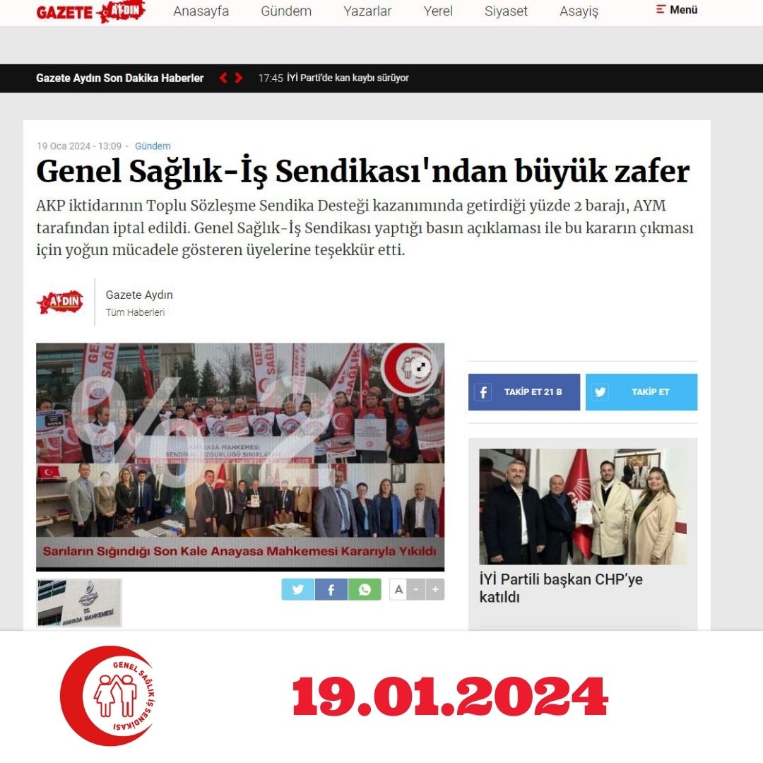 Gazete Aydın'da 19.1.2024 tarihli yayımlanan haberimiz: Genel Sağlık-İş Sendikası'ndan büyük zafer / https://gazeteaydin.com/haber/18943128/genel-saglik-is-sendikasindan-buyuk-zafer