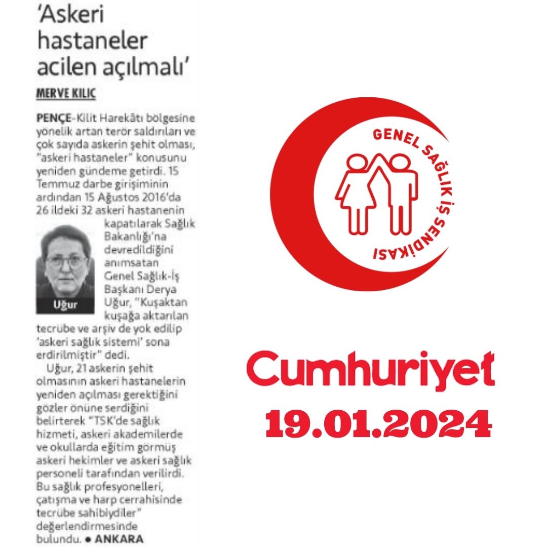 Cumhuriyet Gazetesinde 19.01.2024 tarihli çıkan haberimiz: https://www.cumhuriyet.com.tr/saglik/genel-saglik-is-uyardi-askeri-hastaneler-acilen-acilmali-2164846?utm_medium=HaberKaynagi&utm_source=HaberKaynagi