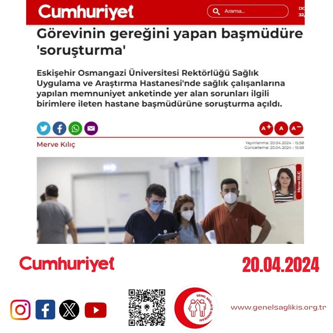 Eskişehir Osmangazi Üniversitesi Rektörlüğü Sağlık Uygulama ve Araştırma Hastanesi Başhekimliği Kalite Yönetim Birimi tarafından çalışanlara uygulanan memnuniyet anketleri ve öneri değerlendirme raporu sonuçlarını gazetemiz Cumhuriyet gündeme taşımıştı. Hastane Başmüdürü Ayşe Kırcı imzasıyla 18 Mart’ta ilgili birimlere iletilen değerlendirme raporu; kurumdaki liyakat sorunu, sağlık emekçilerini yıldırma politikalarını ve çalışma barışının bozduğunu gözler önüne serdi. Hastanede yaşanan sorunları kamuoyuna yansımasının ardından ceza sağlık emekçisine kesildi. Genel Sağlık-İş Sendikasından edinilen bilgiye göre Anket sonucunda sağlık çalışanlarının şikayet ve önerilerini ilgili birimlere ileten Ayşe Kırcı'ya soruşturma açıldı.