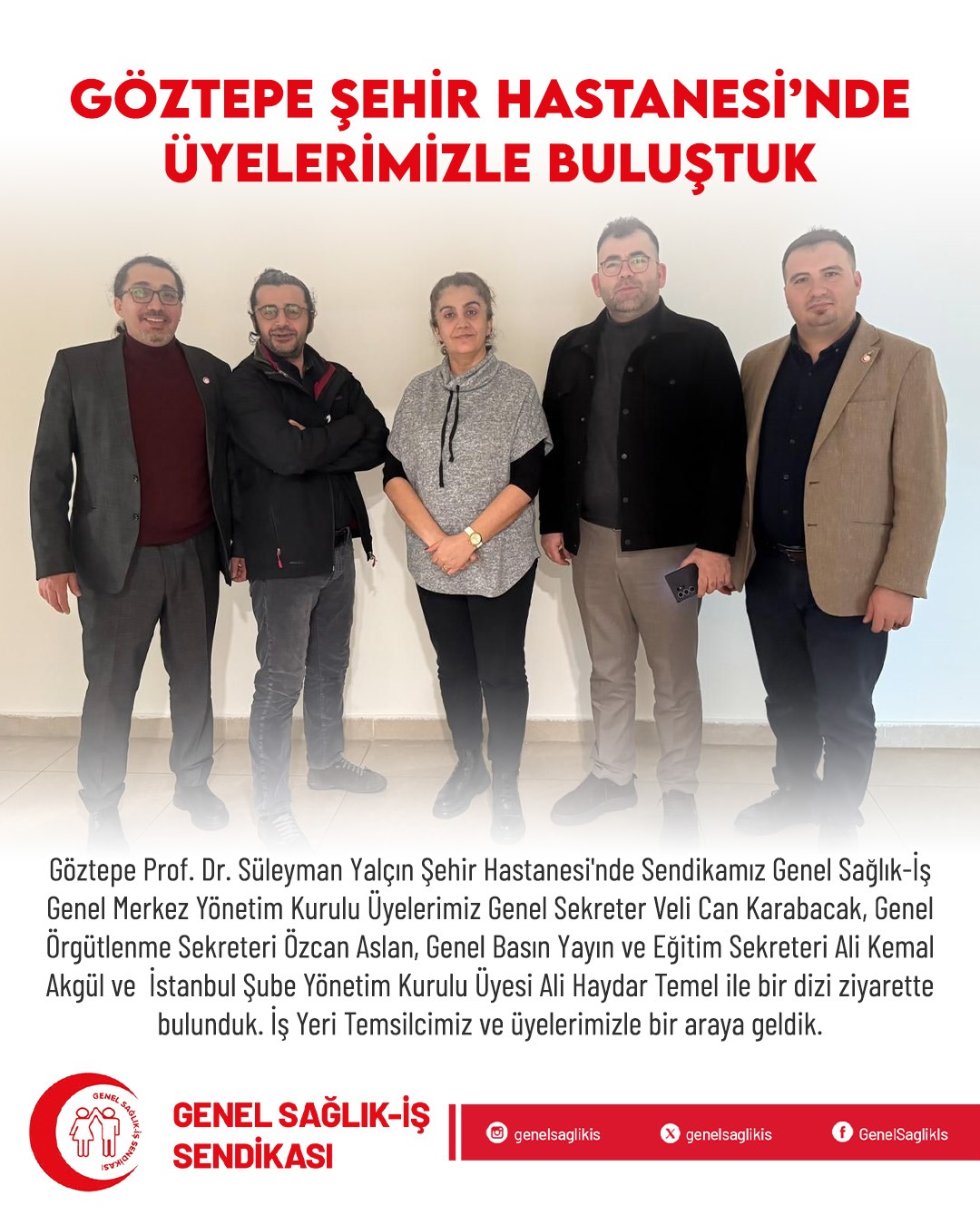 Göztepe Prof. Dr. Süleyman Yalçın Şehir Hastanesi'nde Sendikamız Genel Sağlık-İş Genel Merkez Yönetim Kurulu Üyelerimiz Genel Sekreter Veli Can Karabacak, Genel Örgütlenme Sekreteri Özcan Arslan, Genel Basın Yayın ve Eğitim Sekreteri Ali Kemal Akgül ve İstanbul Şube Yönetim Kurulu Üyesi Ali Haydar Temel ile bir dizi ziyarette bulunduk. İş yeri temsilcimiz ve üyelerimizle bir araya geldik.