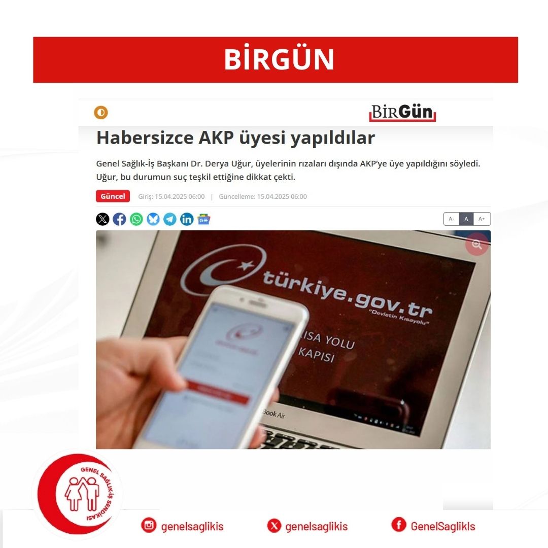 Genel Sağlık-İş Başkanı Dr. Derya Uğur, üyelerinin rızaları dışında AKP’ye üye yapıldığını söyledi. Uğur, bu durumun suç teşkil ettiğine dikkat çekti.