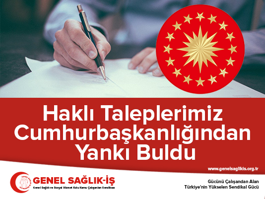 Genel Sağlık-İş tarafından sağlık çalışanlarının taleplerinin iletildiği yazıya Cumhurbaşkanlığı İdari İşler Başkanlığı Hukuk ve Mevzuat Genel Müdürlüğü tarafından yanıt geldi. Yazıda, Genel Sağlık-İş tarafından gönderile yazının değerlendirilerek uygun görülmesi halinde gerekli mevzuat çalışmalarının yürütülmesi ve/veya teklifte bulunulması için Hazine ve Maliye Bakanlığı ile Sağlık Bakanlığına iletildiği kaydedildi.