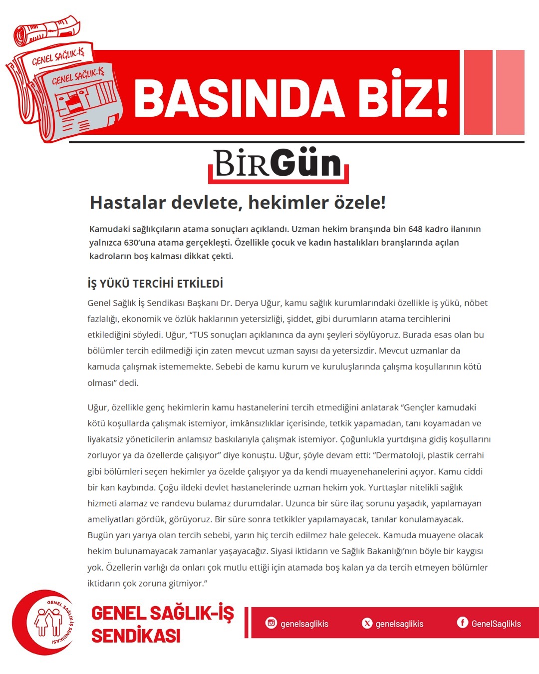Genel Sağlık İş Sendikası Başkanı Dr. Derya Uğur, kamu