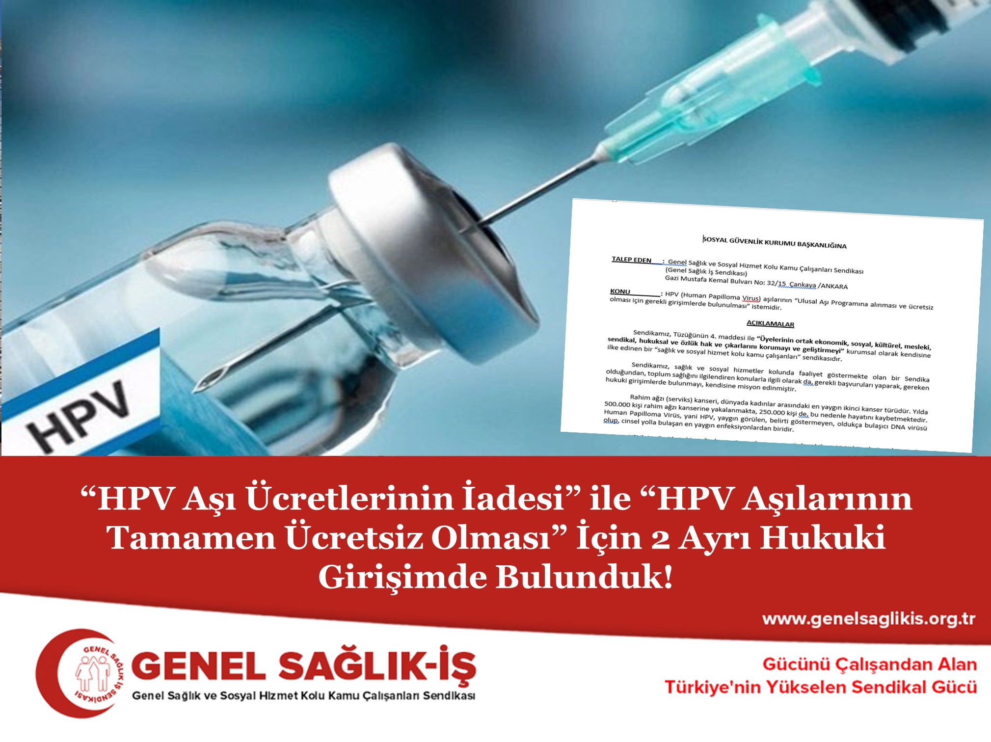 HPV aşılarının Ulusal Aşı Programında yer almaması nedeniyle, HPV aşı ücretlerinin ödenmesi ile bu aşıların ücretsiz olarak uygulanmasının sağlanması adına Genel Sağlık-İş tarafından iki farklı hukuki girişimde bulunulmuştur.