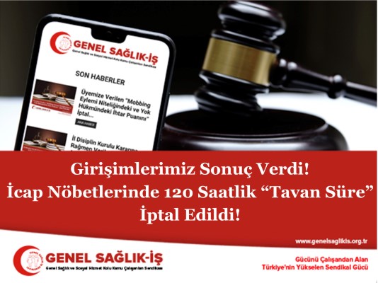 120 saatlik tavan süre ile ilgili gerek Sendikamızca yapılan girişimler, gerekse de, diğer meslek örgütleri tarafından yapılan girişim ve kamuoyu farkındalığının oluşturulması sonucunda 05.05.2023 tarih ve 32181 sayılı Resmi Gazete’de yayımlanan Anayasa Mahkemesi’nin 2022/97 E. – 2023/13 K. sayılı kararı ile “en başından beri savunduğumuz üzere” 657 sayılı Devlet Memurları Kanunu'nun Ek 33. maddesinin 3. fıkrasının 2. cümlesinde yer alan "Bu şekilde ücretlendirilebilecek toplam icap nöbeti süresi aylık 120 saati geçemez." ibaresi, Anayasa’ya aykırı bulunarak İPTAL EDİLMİŞTİR.