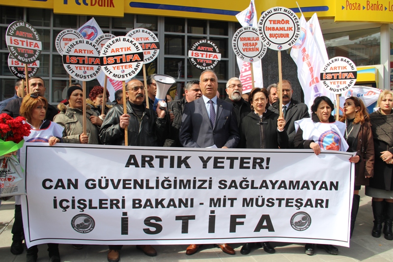Genel Başkanımız Zekiye Bacaksız, Genel Sekreterimiz Reyhan Aydoğan, Konfederasyonumuz Birleşik Kamu-İş Genel Başkanı Hasan Kütük ve MYK üyeleri ile bağlı sendikaların MYK üyeleri Kızılay postanesi önünde “Artık yeter! Can güvenliğimizi sağlayamayan İçişleri Bakanı, MİT Müsteşarı istifa” pankartı altında toplandı.