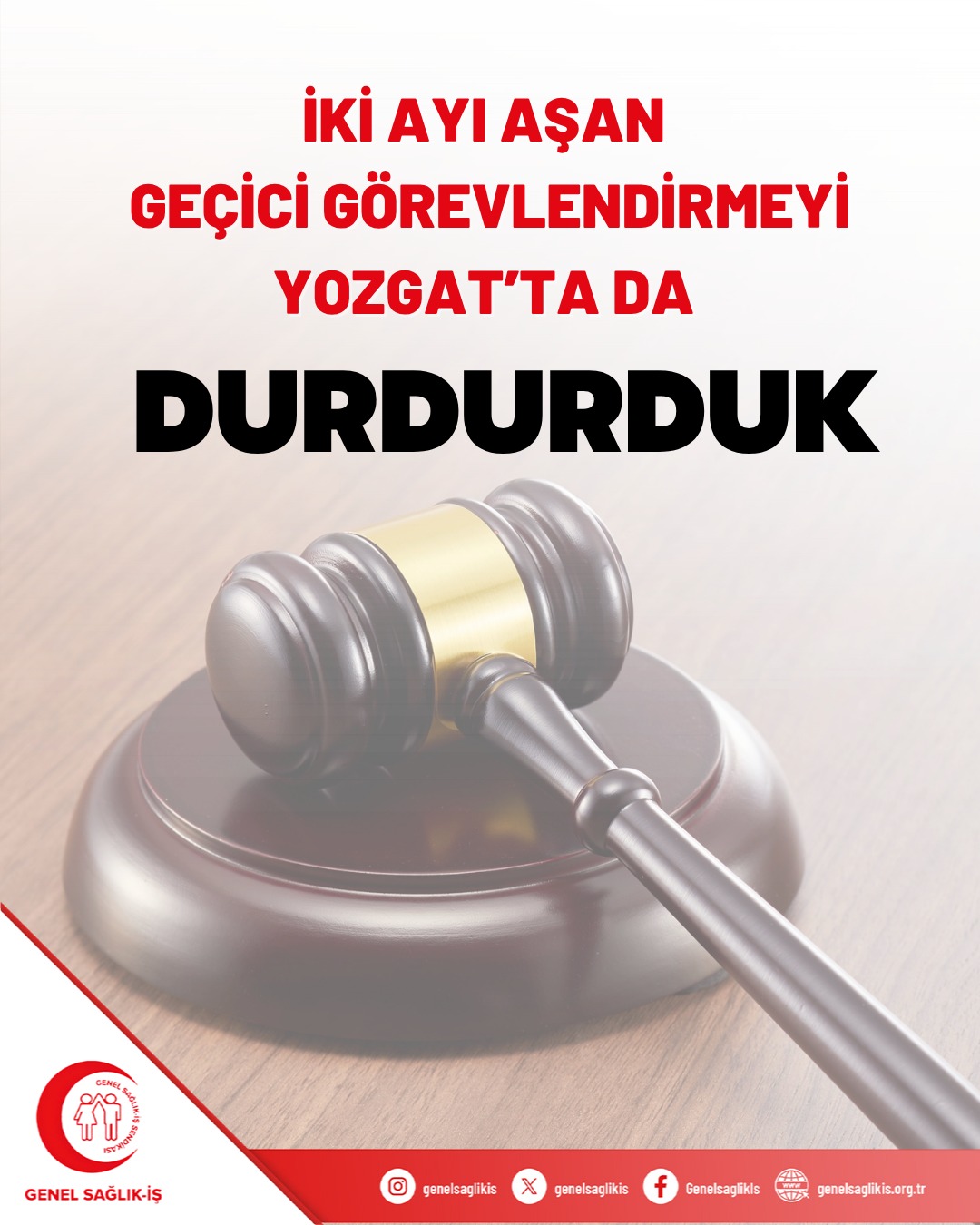Yozgat İdare Mahkemesi, davamızı haklı bularak, “Bu durumda, dosyadaki bilgi ve belgeler ile mevzuat hükümlerinin birlikte değerlendirilmesinden; davalı idare tarafından, davacının hizmetine duyulan ihtiyaç doğrultusunda görevlendirilme işlemi yapıldığı belirtilmekte ise de, yukarıda anılan mevzuat hükmüne göre re'sen yapılan geçici görevlendirme süresinin bir mali yılda iki ayı geçemeyeceği, ancak dava konusu görevlendirme ile davacının görevlendirme süresinin bir mali yıl içerisinde iki ayı geçtiği anlaşıldığından, davacının Sorgun Devlet Hastanesi Baştabipliği emrinde geçici olarak görevlendirilmesine ilişkin dava konusu işlemde hukuka ve mevzuata uyarlık bulunmamaktadır.” şeklindeki gerekçe ile söz konusu geçici görevlendirme idari işleminin hukuka aykırılığını tescillemiş, YÜRÜTMENİN DURDURULMASINA karar vermiştir.
