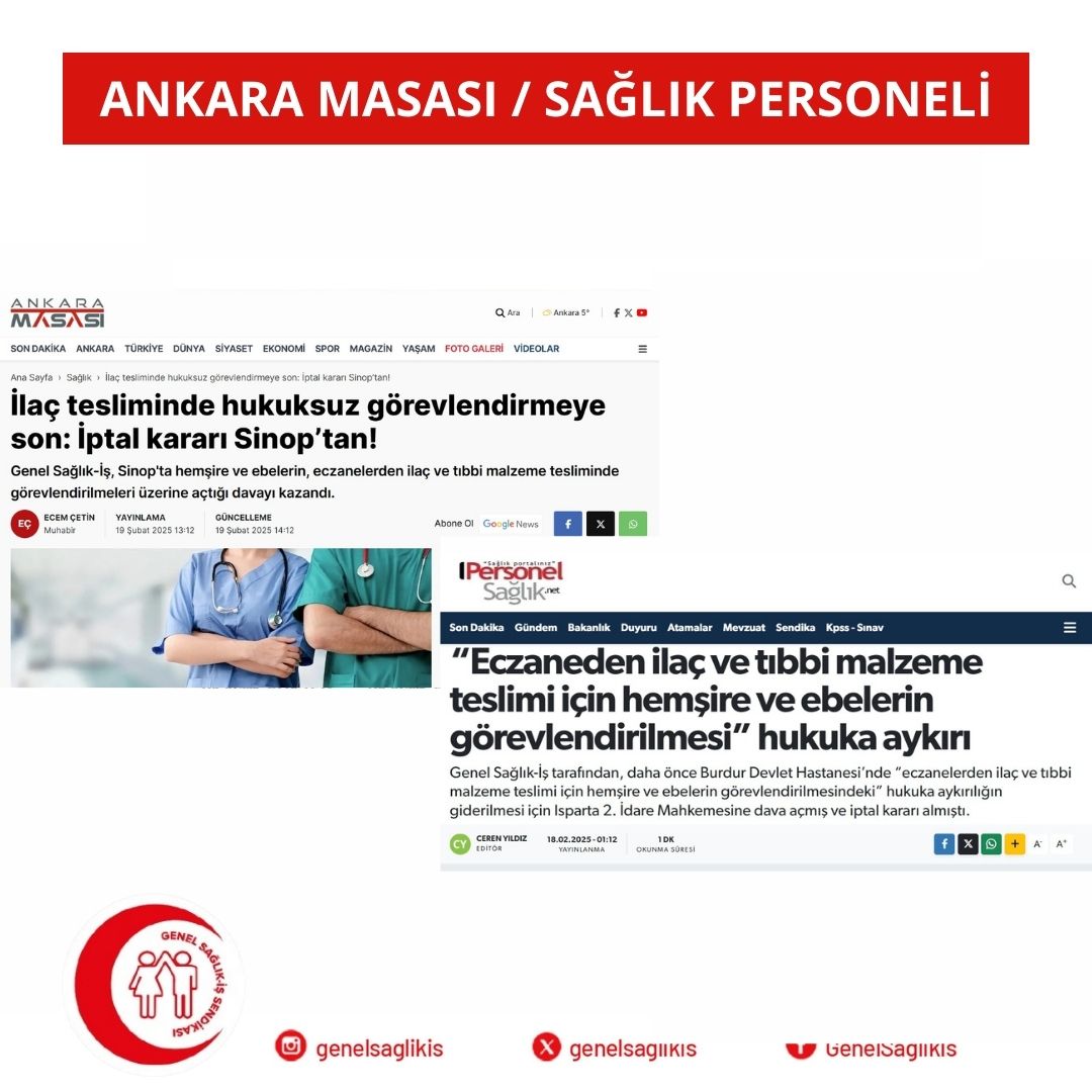 Genel Sağlık-İş, Sinop'ta hemşire ve ebelerin, eczanelerden ilaç ve tıbbi malzeme tesliminde görevlendirilmeleri üzerine açtığı davayı kazandı.