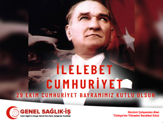 Genel Sağlık-İş, ebedi önderimiz Atatürk’ün emaneti Türkiye Cumhuriyeti’nin bağımsızlığını korumak, Atatürk ilke ve devrimlerini sonsuza kadar yaşatmak için tüm çabayı gösterecektir. Bu anlayış ve kararlılıkla, Cumhuriyetimizin kurucusu Ebedi Önderimiz Mustafa Kemal Atatürk ve mücadele arkadaşlarını saygıyla anıyor, Ulusumuzun 29 Ekim Cumhuriyet Bayramı’nı kutluyoruz.