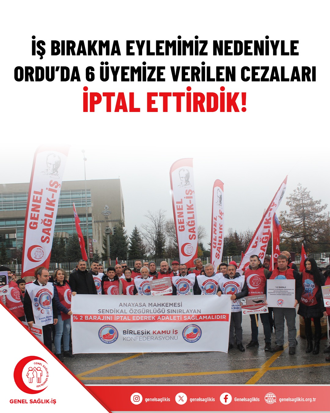 Ordu İdare Mahkemesi kararlarında, “Bu durumda, yukarıda yer verilen mevzuat hükümleri ile Avrupa İnsan Hakları Mahkemesi ve Anayasa Mahkemesi kararlarının birlikte değerlendirilmesinden; davacının sendikal haklar ve örgütlenme özgürlüğü kapsamında çalışma hayatına ilişkin mesleki çıkarlarını savunmak amacıyla iş bırakma şeklinde gerçekleştirilen eyleme katılmasının, demokratik toplum düzeninin gerekleri ve ölçülülük ilkeleriyle bağdaştığı, bu nedenle cezalandırılmasının Anayasa'nın 51. maddesinde güvence altına alınan sendika hakkını ihlal edici nitelikte olduğu, davacının sendikal hakkını kullanmak suretiyle yasal bir mazeretinin bulunduğu, kaldı ki; davacının görev yaptığı aile sağlığı merkezinin birinci basamak sağlık hizmeti veren kuruluşlar arasında yer aldığı, aile sağlığı merkezlerinde aile hekimi ve aile sağlığı çalışanları tarafından, birinci basamak sağlık hizmetlerinden bireye yönelik koruyucu, tanı, tedavi ve rehabilite edici sağlık hizmetlerinin verildiği, davalı idarece; davacının anılan tarihte göreve gelmeyerek, sağlık hizmetlerini aksattığına ve vatandaşları sağlık haklarından mahrum bıraktığına ilişkin somut herhangi bir tespitin sunulamadığı ve vatandaşların sağlık haklarını kullanamadıklarına dair herhangi bir şikayetin bulunmadığı anlaşıldığından…” denilerek, 6 ÜYEMİZE VERİLEN 6 UYARMA CEZASIYLA İLGİLİ AYRI AYRI 6 İPTAL KARARI VERİLMİŞTİR.
