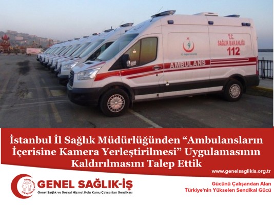 Sendikamız Genel Sağlık-İş, İstanbul İl Sağlık Müdürlüğüne bir yazı göndererek “Ambulansların içerisine kamera yerleştirilmesine” dair idari işlemin ve uygulamanın kaldırılmasını talep etti.