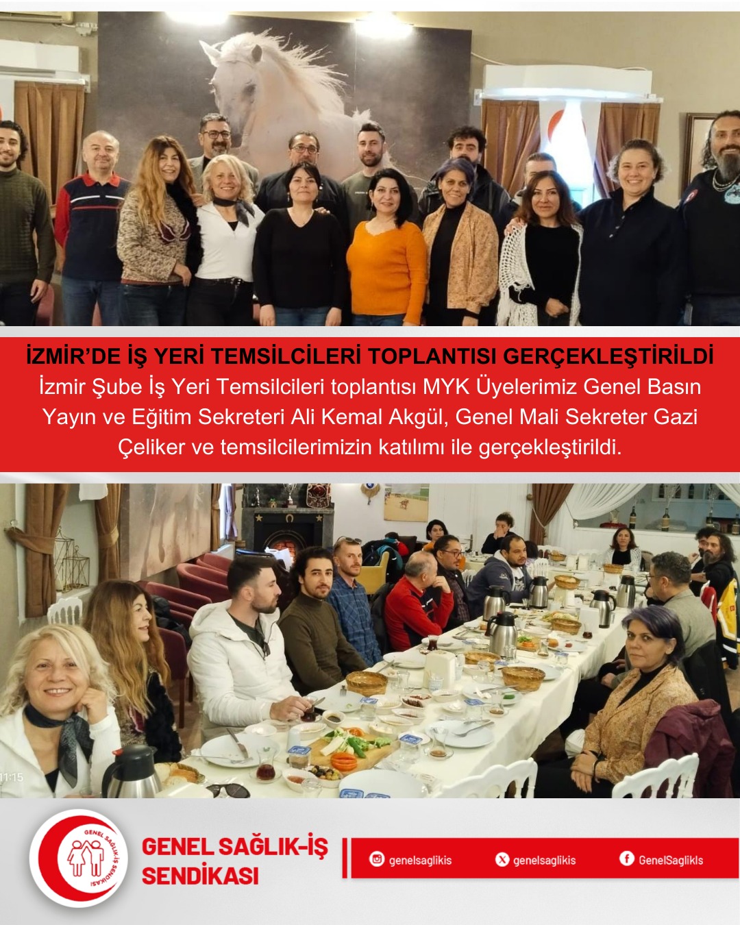 İzmir Şube İş Yeri Temsilcileri toplantısı MYK Üyelerimiz Genel Basın Yayın ve Eğitim Sekreteri Ali Kemal Akgül, Genel Mali Sekreter Gazi Çeliker ve temsilcilerimizin katılımı ile gerçekleştirildi.
