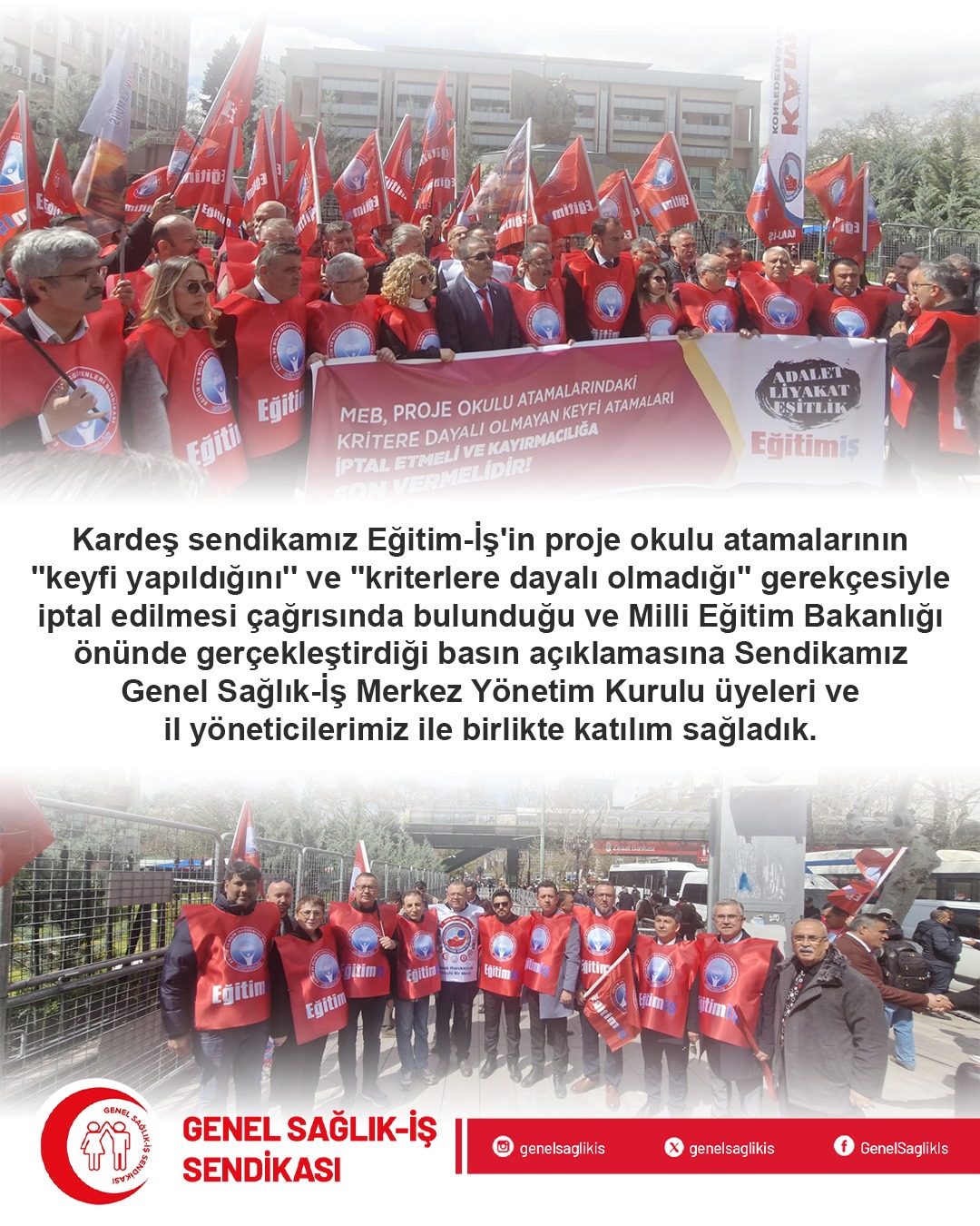 Kardeş sendikamız Eğitim-İş'in proje okulu atamalarının "keyfi yapıldığını" ve "kriterlere dayalı olmadığı" gerekçesiyle iptal edilmesi çağrısında bulunduğu ve Milli Eğitim Bakanlığı önünde gerçekleştirdiği basın açıklamasına Sendikamız Genel Sağlık-İş Merkez Yönetim Kurulu üyeleri ve il yöneticilerimiz ile birlikte katılım sağladık.