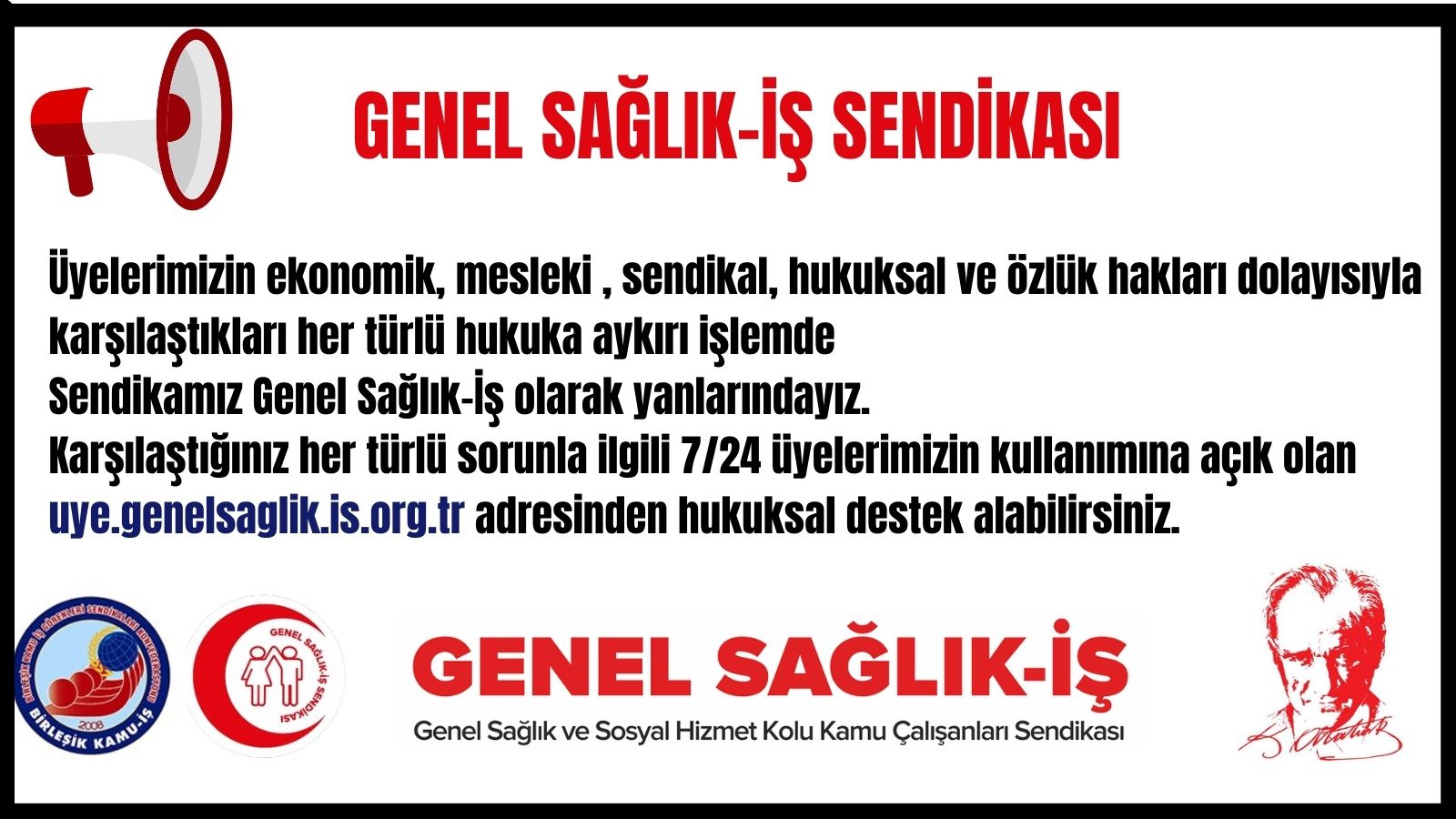 Karşılaştığınız her türlü sorunla ilgili 7/24 üyelerimizin kullanımına açık olan uye.genelsaglik.is.org.tr adresinden hukuksal destek alabilirsiniz.