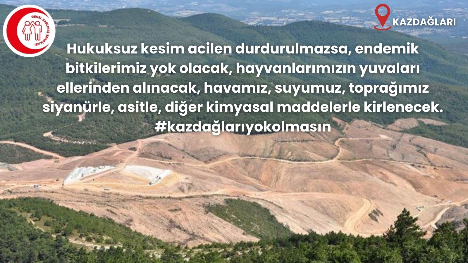 Hukuksuz kesim acilen durdurulmazsa, endemik bitkilerimiz yok olacak, hayvanlarımızın yuvaları ellerinden alınacak, havamız, suyumuz, toprağımız siyanürle, asitle, diğer kimyasal maddelerle kirlenecek.