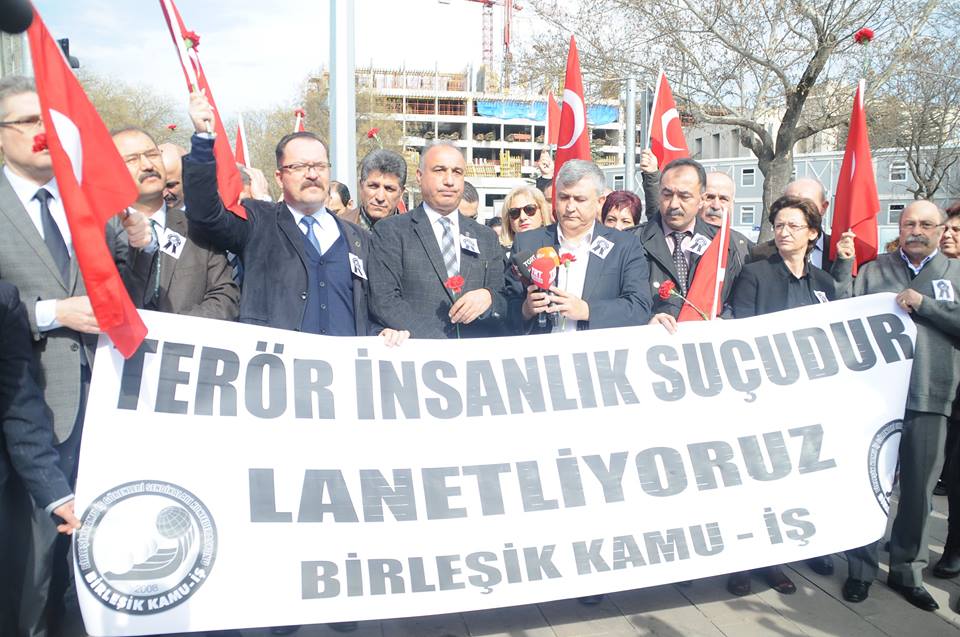 Ankara’da, İnönü Bulvarı’nı Dikmen Caddesi’ne bağlayan Merasim Sokak’ta askeri servi araçlarına düzenlen bombalı saldırı sonucu hayatını kaybeden 28 kişiyi anmak ve yapılan terör saldırısını lanetlemek için Birleşik Kamu-İş Konfederasyonu ve bağlı sendikaları ile şube yöneticileri Güvenpark’ta toplanarak patlamanın olduğu yere yürüdü.