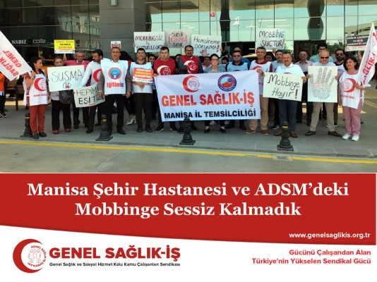 Manisa Şehir Hastanesi ve ve Manisa Ağız ve Diş Sağlığı Merkezinde Genel Sağlık-İş üyesi sağlık çalışanlarına yönelik mobbing ve baskıları protesto etmek, yapılan hukuksuz uygulamaları kamuoyunun gündemine taşımak için basın açıklaması düzenledik.