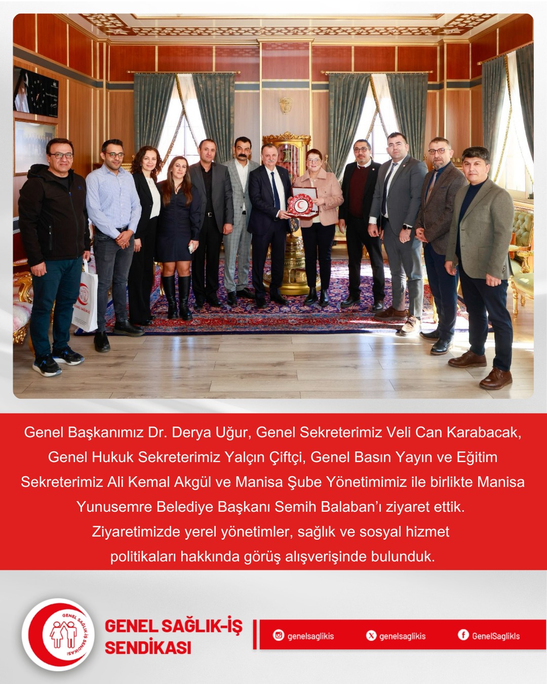 Genel Başkanımız Dr. Derya Uğur, Genel Sekreterimiz Veli Can Karabacak, Genel Hukuk Sekreterimiz Yalçın Çiftçi, Genel Basın Yayın ve Eğitim Sekreterimiz Ali Kemal Akgül ve Manisa Şube Yönetimimiz ile birlikte Manisa Yunusemre Belediye Başkanı Semih Balaban'ı ziyaret ettik. Ziyaretimizde yerel yönetimler, sağlık ve sosyal hizmet politikaları hakkında görüş alışverişinde bulunduk.
