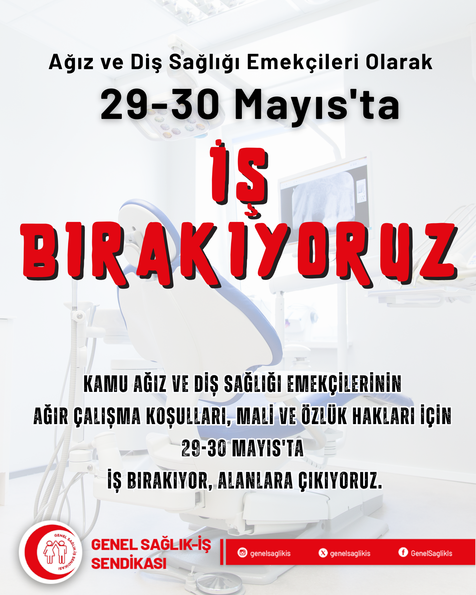 Merkez Yönetim Kurulumuz tarafından 28-29 Mayıs 2025 tarihlerinde ağız ve diş sağlığı hizmeti veren tüm kamu kurum ve kuruluşlarında iş bırakma kararı alınmıştır. Karara aşağıdaki linkten ulaşabilirsiniz.