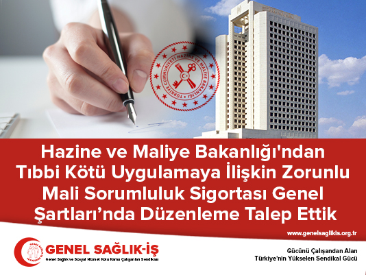 Tıbbi Kötü Uygulamaya İlişkin Zorunlu Mali Sorumluluk Sigortası Genel Şartları’nda bu salgınla mücadelede görevlendirilen tüm hekimleri kapsayacak bir değişikliğin yapılarak, olası bir riziko durumunda poliçenin risk grubu 4 üzerinden koruma sağlayacak bir değişikliğin yapılması elzemdir. Bu konuda hem Hazine ve Maliye Bakanlığı hem de Sağlık Bakanlığı nezdinde girişimlerde bulunulmuş, ayrıca Sağlık Bakanlığına gönderilen talebimizde Tıbbi Kötü Uygulamaya İlişkin Zorunlu Mali Sorumluluk Sigortası’nın sağlık hizmetinde görev alan tüm sağlık emekçilerini kapsaması ve mali tüm sorumluluğunun işverence karşılanması için yazılarımız yazılmış olup durumun takipçisiyiz.