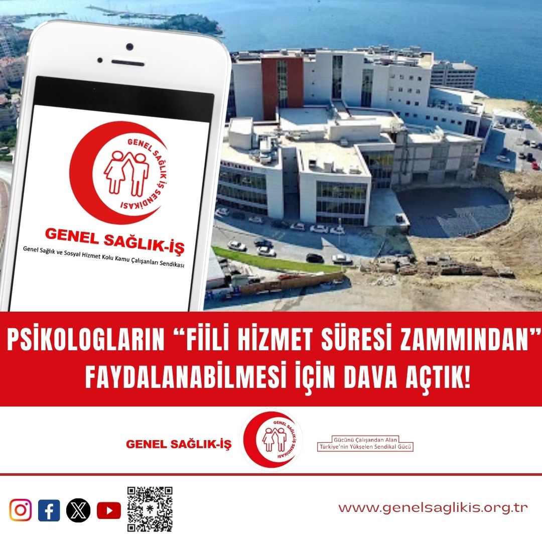 Psikologların, fiili hizmet zammı süresinden faydalandırılması için girişimde bulunmak üzere; “Kuşadası Devlet Hastanesi'nde “psikolog” kadrosunda görev yapmakta olan üyemize, dilekçe hazırlanarak gönderilmiş, üyemizin kurum başvurusu yapması sağlanmıştır. Üyemizin başvurusunun reddedilmesi üzerine Hukuk Müşavirliğimizin yoğun hazırlık süreci sonunda Aydın 2. İdare Mahkemesi’nde dava açılmıştır.