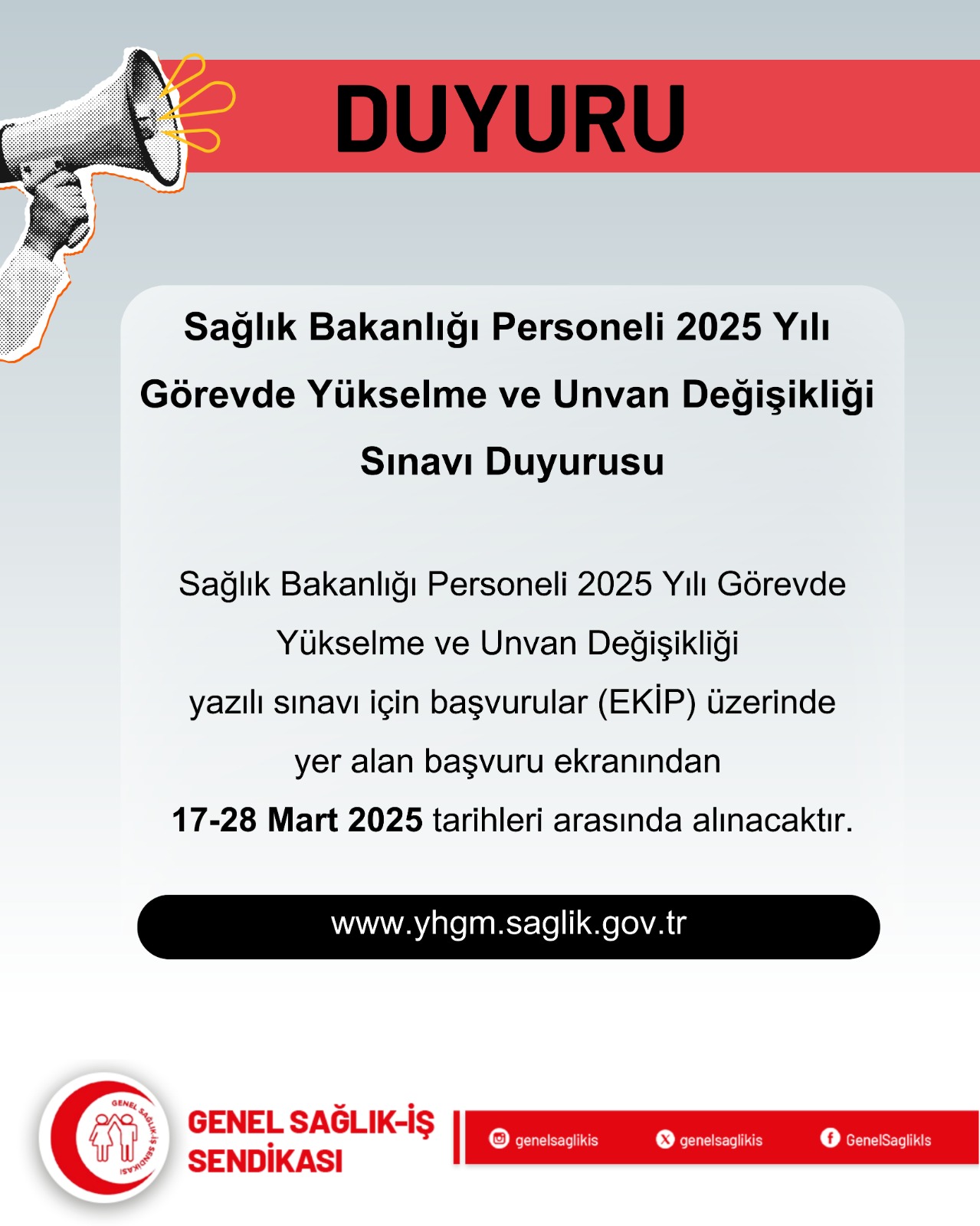 Sağlık Bakanlığı Personeli 2025 Yılı Görevde Yükselme ve Unvan Değişikliği yazılı sınavı için başvurular (EKİP) üzerinde yer alan başvuru ekranından 17-28 Mart 2025 tarihleri arasında alınacaktır.