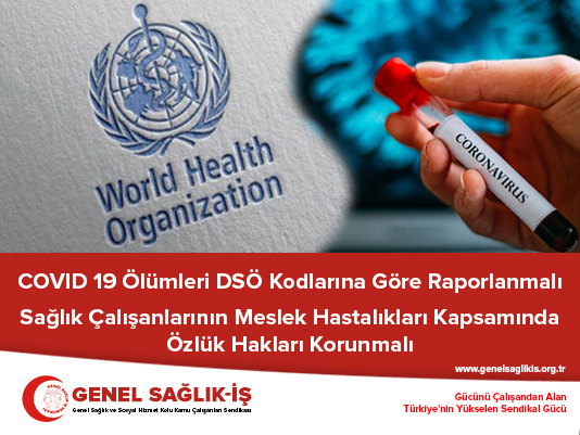 Genel Sağlık-İş olarak COVID-19 ölümlerinin Dünya Sağlık Örgütü kodlarına göre raporlanması konusunda ısrarcıyız. Gerçek veriler ışığında yapılacak mücadelenin planlanması ve mücadelenin daha etkin olması açısından oldukça önemlidir. Ayrıca COVID-19 tanısı konulan sağlık çalışanlarının hastalığının iş kazası/meslek hastalığı olarak kabul edilmesi sağlık çalışanları için bir haktır. Ancak, COVID-19 ölümlerinin Dünya Sağlık Örgütü kodlarına göre raporlanmaması sağlık çalışanlarını da mağdur etmekte; özlük haklarında oldukça önemli kayıplara neden olmaktadır.