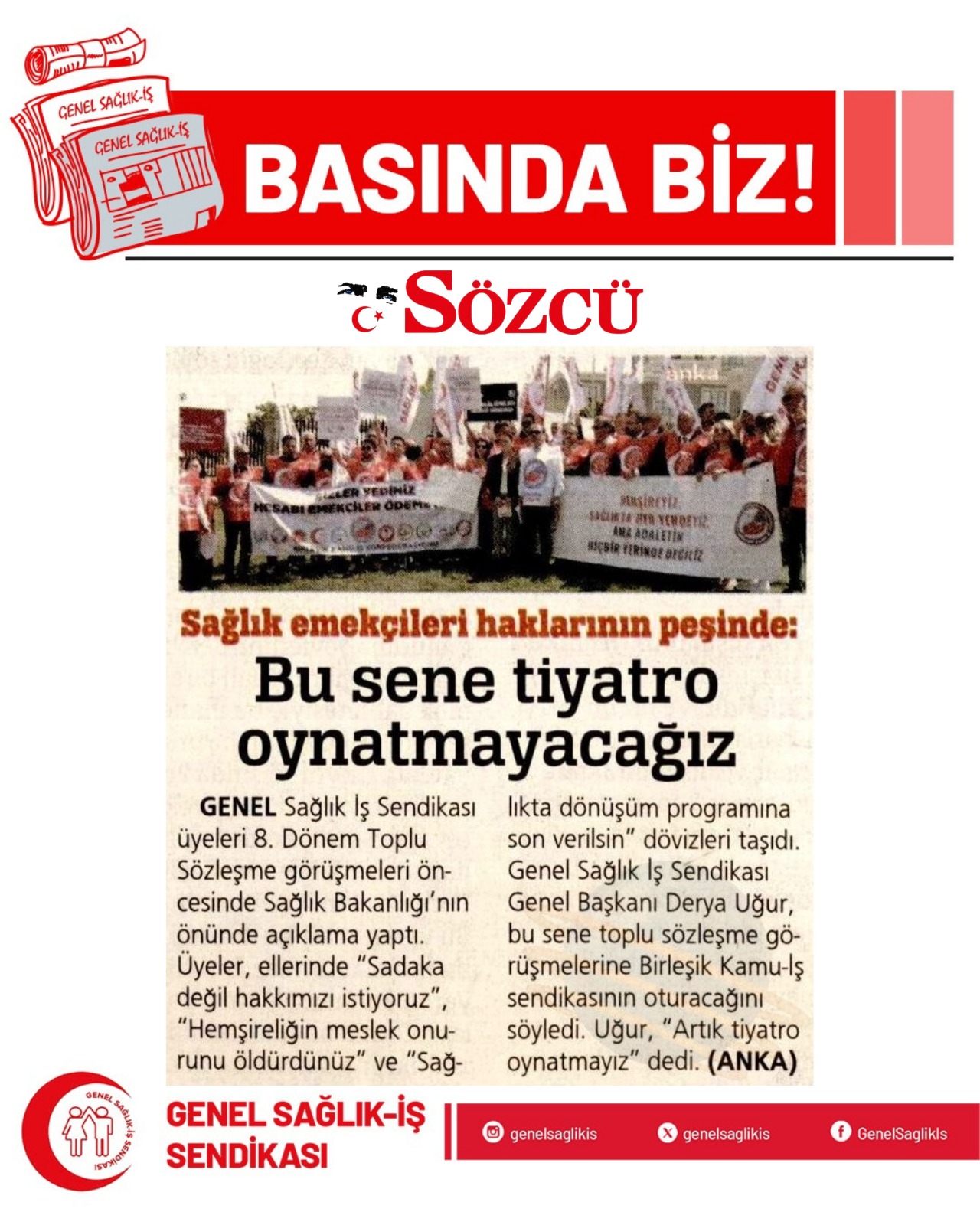 Genel Sağlık-İş Sendikası üyeleri 8. Dönem Toplu Sözleşme görüşmeleri öncesinde Sağlık Bakanlığı'nın önünde açıklama yaptı. Üyeler, ellerinde "Sadaka değil hakkımızı istiyoruz", "Hemşireliğin meslek onu- runu öldürdünüz" ve "Sağlıkta dönüşüm programına son verilsin" dövizleri taşıdı.
