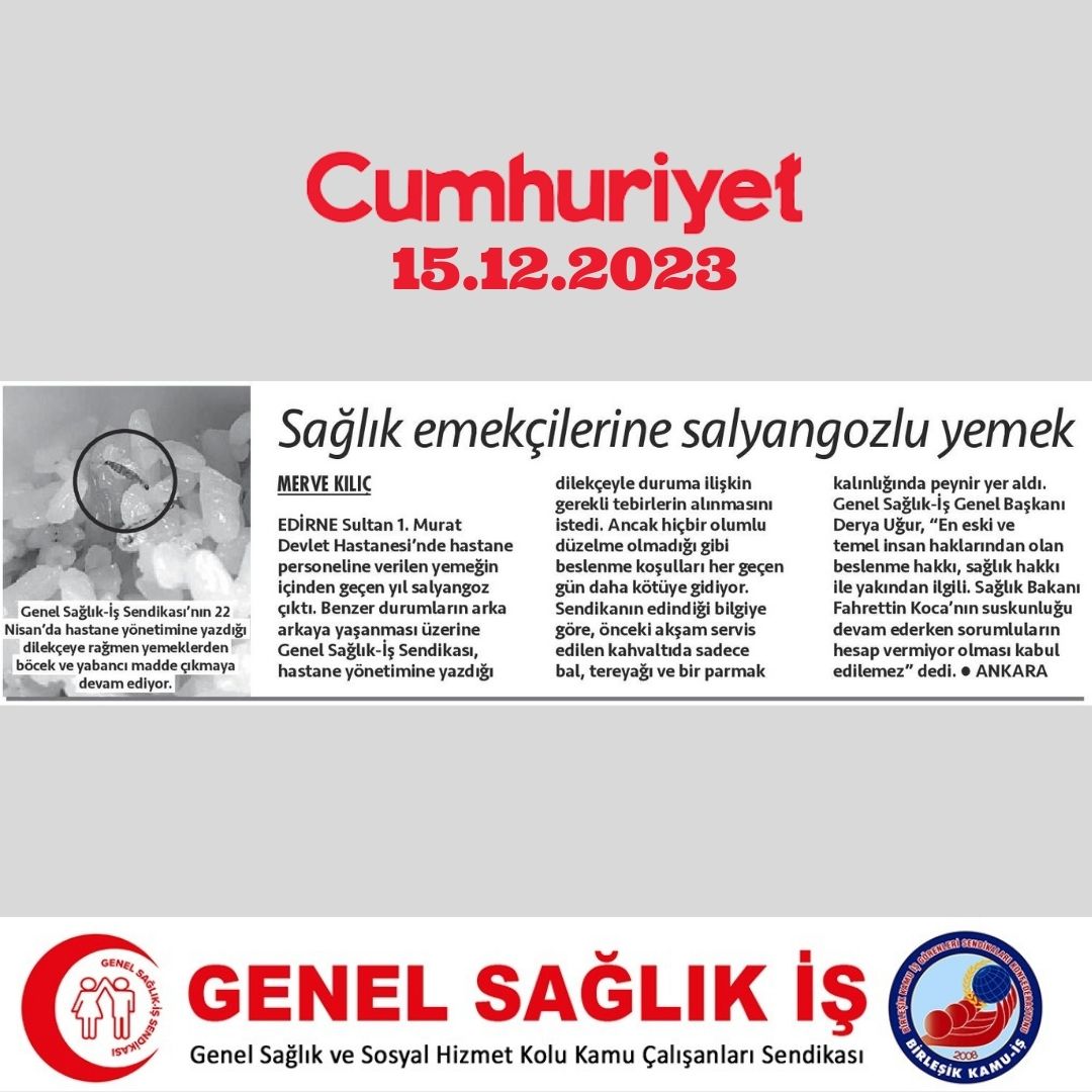 Sendikamız Genel Sağlık-İş'in 15.12.2023 tarihinde Cumhuriyet Gazetesinde çıkan haberi okumak için: https://www.cumhuriyet.com.tr/saglik/saglik-emekcilerine-salyangozlu-yemek-2151773?utm_medium=HaberKaynagi&utm_source=HaberKaynagi